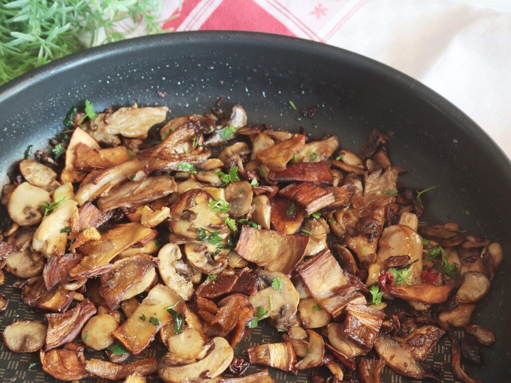 Drücken Sie die Pilze aus und braten Sie den Knoblauch in einer Pfanne mit Öl an, fügen Sie die Pilze hinzu und bräunen Sie sie an, fügen Sie die gemischten Pilze hinzu und kochen Sie sie einige Minuten lang, Sie werden sehen, dass sie viel Wasser abgeben, nehmen Sie den Deckel ab und lassen Sie das Wasser verdunsten.