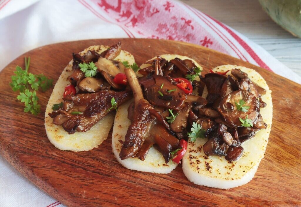 Es dauert 20 Minuten, um die Pilze zu kochen, am Ende der Garzeit mit gehackter Petersilie bestreuen und in der Zwischenzeit die bereits gekochte weiße Polenta in Scheiben schneiden, in der Pfanne anbraten und auf beiden Seiten rösten.
