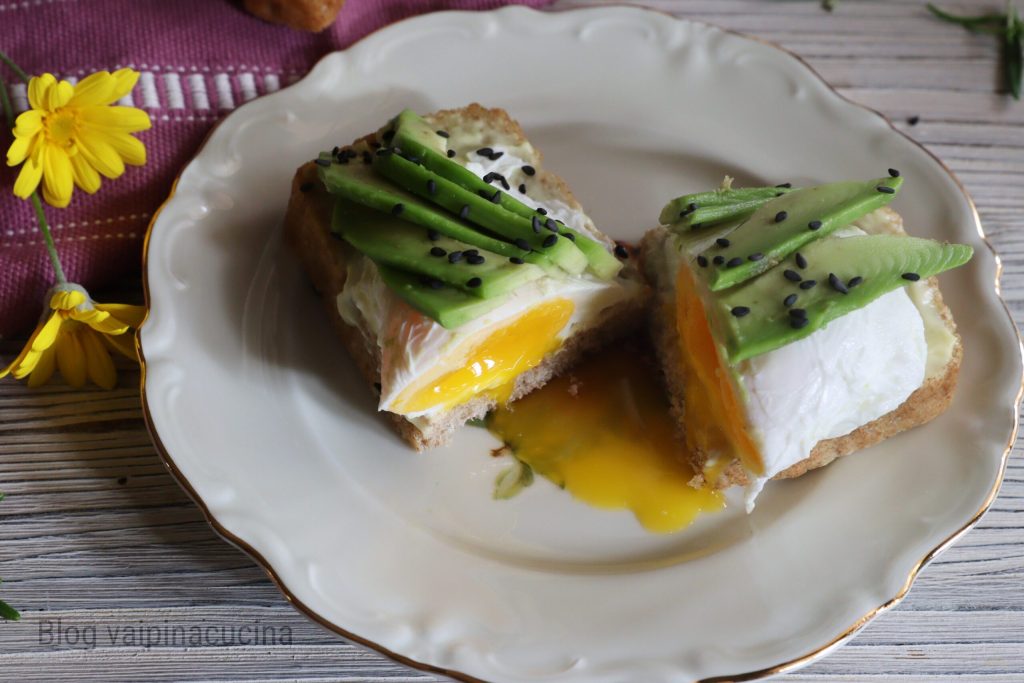• Schneiden Sie die Avocado der Länge nach in zwei Hälften, entfernen Sie den Kern und die Schale, schneiden Sie dünne Scheiben und legen Sie sie auf die Eier.