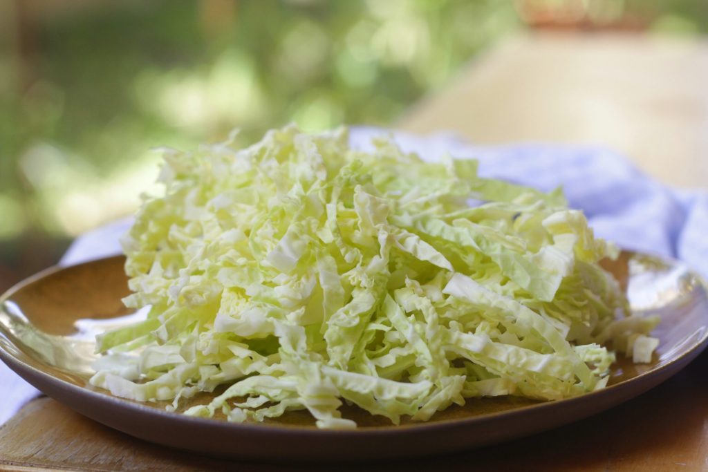 Waschen Sie die Wirsingblätter und schneiden Sie sie in Streifen.