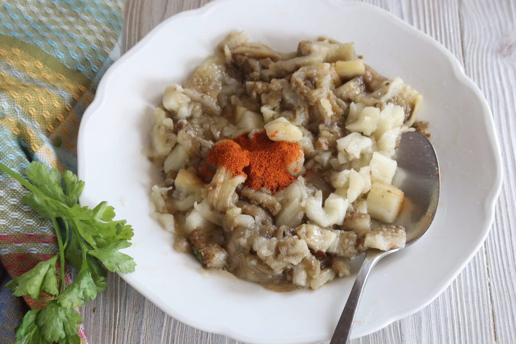 Die geröstete Aubergine von der Schale befreien und mit der Gabel zerdrücken, mit Paprika und Kreuzkümmelsamen, Olivenöl und Salz, Petersilie und Chili würzen.