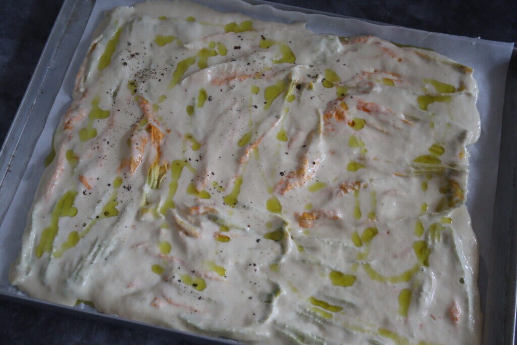 Auf das Backblech mit Backpapier und einem Schuss Öl legen Sie die im Teig eingetauchten Zucchiniblüten,