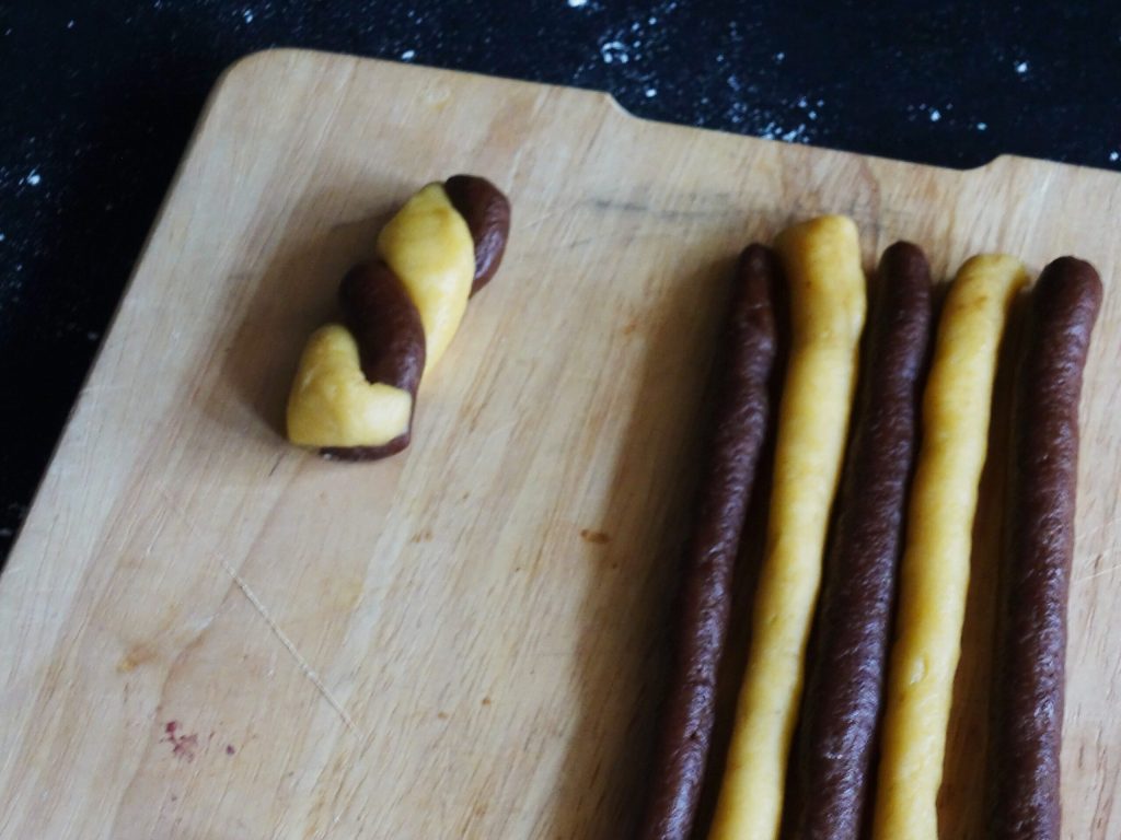 Geben Sie das Mehl und den Zucker auf das Teigbrett, mischen Sie und fügen Sie die kalte Butter in Stückchen hinzu. Vermischen Sie alles mit den Fingerspitzen, bis der Teig wie Paniermehl aussieht, machen Sie eine Mulde in der Mitte und fügen Sie das Ei und die Vanilleessenz hinzu. Formen Sie eine Kugel und teilen Sie sie in zwei Hälften. Zu einer Hälfte des Mürbeteigs fügen Sie den Kakao hinzu, schließlich wickeln Sie die beiden Teige separat in Frischhaltefolie und lassen Sie sie mindestens eine halbe Stunde im Kühlschrank ruhen. Nach der Zeit holen Sie die beiden Teige heraus und formen Sie Stränge, legen Sie fünf abwechselnd in den beiden Farben und nachdem Sie sie leicht mit dem Nudelholz geplättet haben, schneiden Sie die Kekse in einem Abstand von drei Zentimetern zueinander, Sie können auch Halbkreise aus dem weißen und schokoladen Mürbeteig formen. Backen Sie im Ofen bei 175 °C für 30 Minuten.