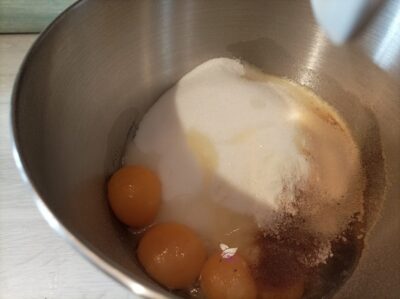• Bereiten Sie den Zuckerguss vor. Schlagen Sie das Eiweiß mit einer Prise Salz steif und fügen Sie am Ende den Puderzucker nach und nach hinzu