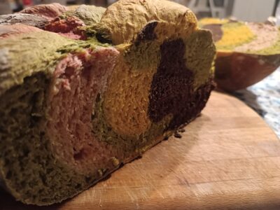 Ich hatte bereits bunte Brote gesehen, in dieser Version finde ich Emotionen, gerade wegen der Intensität der Farben und des Schnitts, der die Geometrie der Kontraste verändert.