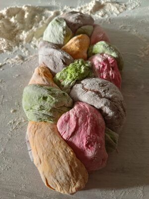 Das Mehl in vier verschiedene Schüsseln teilen und das Gemüse oder die Gewürze hinzufügen, salzen und nacheinander von Hand oder in der Küchenmaschine kneten. Das vorbereitete Wasser mit der Hefe gleichmäßig verteilen, wenn mehr Flüssigkeit benötigt wird, fügen Sie es neutral hinzu (ohne Hefe) Da das Gemüse naturgemäß wässeriger ist, wird weniger benötigt, während für den gelben und den braunen Teig ein paar Tropfen mehr nötig sind