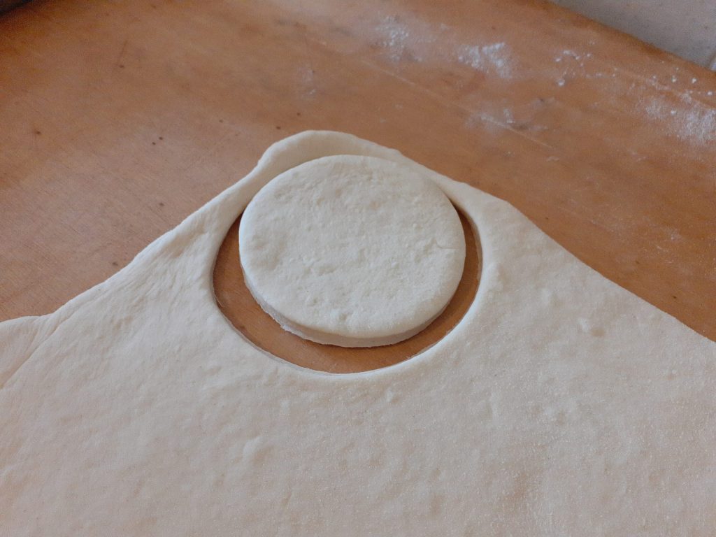 Nach der Ruhezeit auf den Tisch legen und mit dem Nudelholz ausrollen