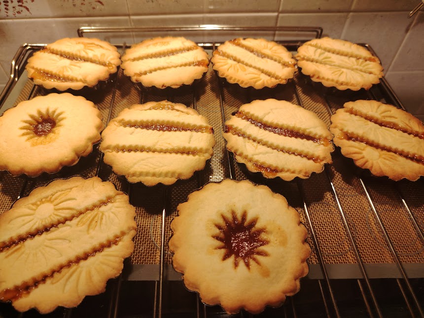 Den restlichen Teig ausrollen und die Streifen für die Tartes und die Kekse nach Belieben dekorieren. Im vorgeheizten Ofen bei 170 Grad etwa zehn Minuten die Kekse und 15 Minuten die kleinen Tartes backen; wenn Sie ein „keksigeres“ Ergebnis bevorzugen, lassen Sie sie etwas länger goldbraun werden
