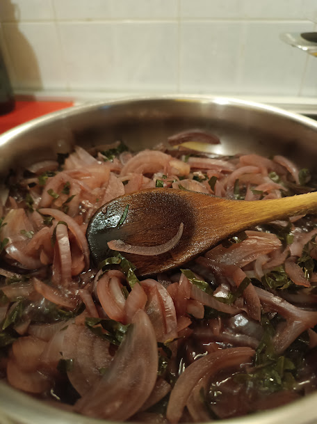 Zu diesem Zeitpunkt fügen Sie die Leber-Kugeln hinzu und nach Zugabe von etwas heißem Wasser lassen Sie es langsam köcheln, damit sich die Zwiebeln auflösen können…Es dauert etwa eine Stunde…