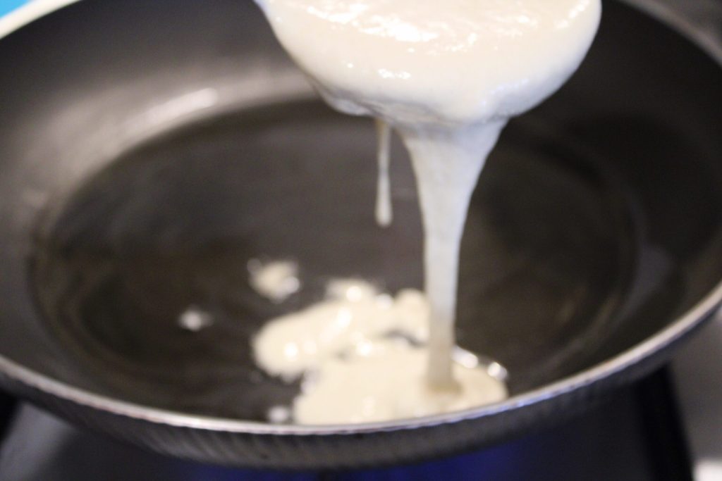 • Öl oder Schmalz in die Pfanne geben, und nach Übertragung Ihres Teigs in ein Gefäß in kreisenden Bewegungen von außen nach innen gießen.