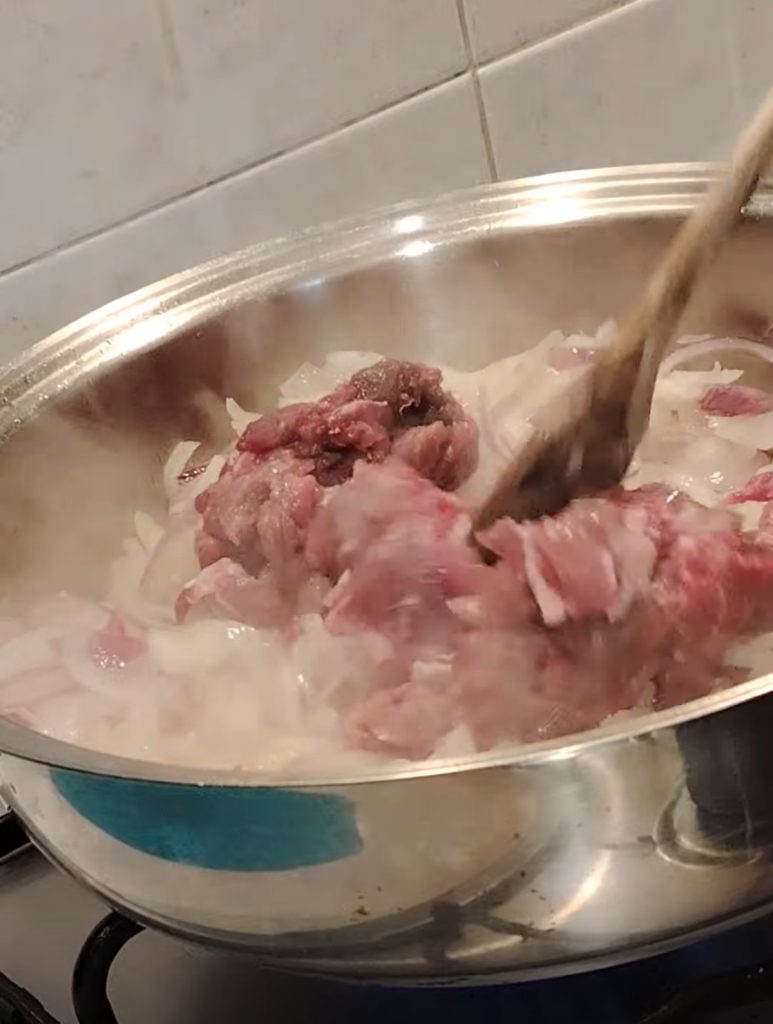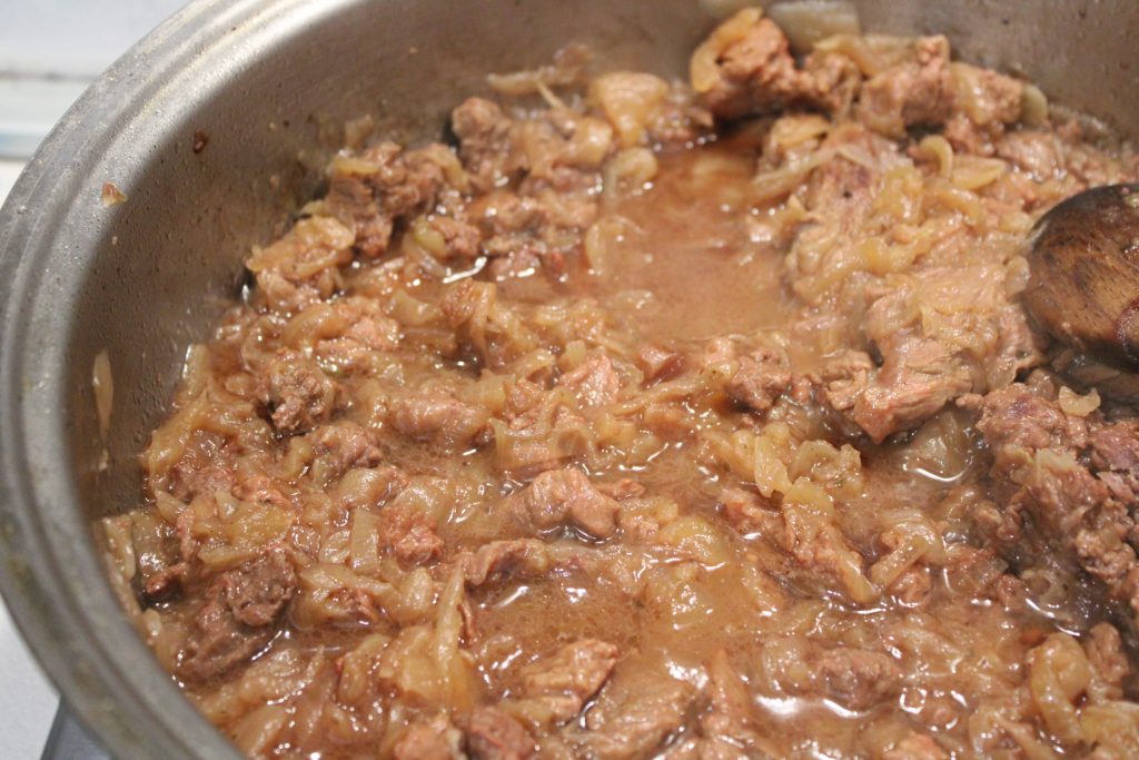 Gebt dann das in kleine Stücke geschnittene Fleisch dazu. Manche bevorzugen größere Stücke; ich nehme lieber kleine Stücke. Bratet alles gut an, gießt den Wein dazu und lasst ihn verkochen.