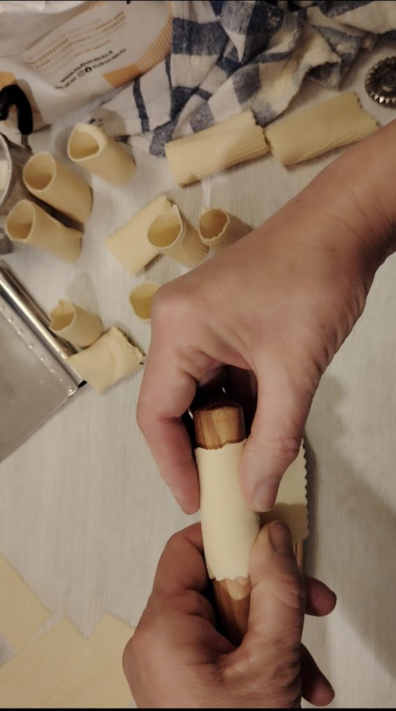 Normalerweise verwendet man gebrochene Ziti; ich habe die hausgemachte Calamarata gewählt — dazu reicht ein dünnes Nudelholz und schon ist es geschafft.