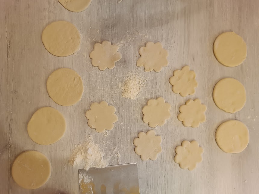 Geben Sie die klassische Form oder was auch immer Sie wünschen, für Aperitifs bereite ich sie in kleinen Scheiben oder in Blumenform zu, indem ich den Teig in einem einzigen Blatt ausrolle und mit den passenden Ausstechern ausschneide