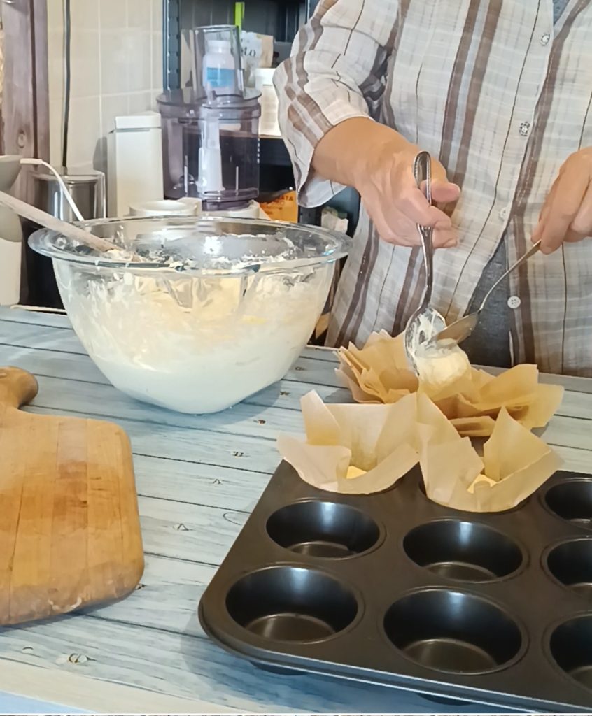 in Papier- oder Silikonförmchen mit zwei Löffeln portionieren und bis zur Verdopplung gehen lassen