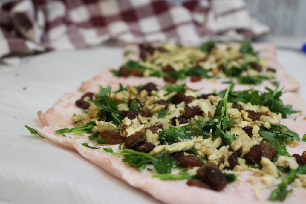 • Sobald die Schwarte fertig ist, legen Sie sie auf ein Schneidebrett und füllen Sie sie mit den aufgelisteten Zutaten, aufgeteilt in vier Teile. Ich lasse die Rosinen persönlich nicht einweichen, wenn Sie wirklich darauf bestehen, verwenden Sie einen Schuss Rotwein; die Petersilie können Sie auch grob gehackt dazugeben, der Rest ergibt sich von selbst…