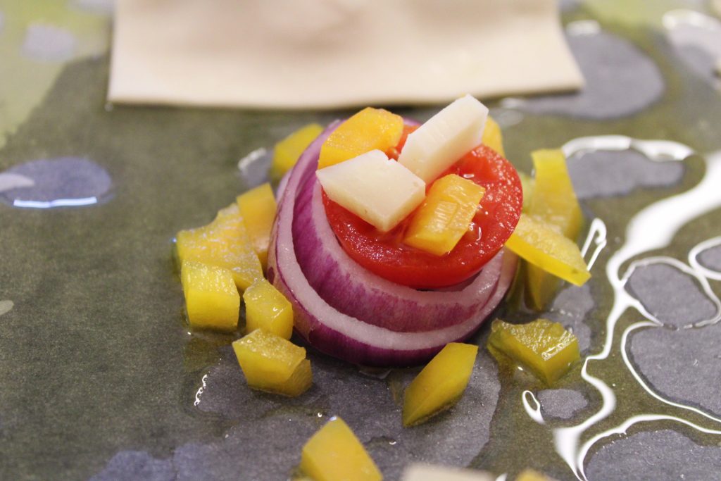 Nachdem Sie das Gemüse gereinigt und geschnitten haben: die Paprika in Würfel, die Zwiebel in Ringe, die Kirschtomaten halbiert und den Käse in Würfel, Scheiben oder gehackt… Platzieren Sie sie auf dem Backpapier, das das Blech auskleidet, nachdem Sie es mit etwas Öl beträufelt haben. Zuerst die Zwiebelringe, dann die Kirschtomaten mit den Samen nach oben, die Paprika und den Käse.