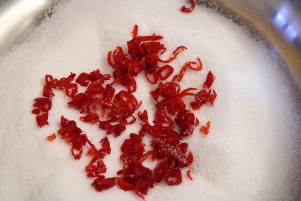 Für dieses Rezept benötigen Sie nur drei Zutaten: Chilis und Zucker, Paprika… und dann ein wenig Wasser.
