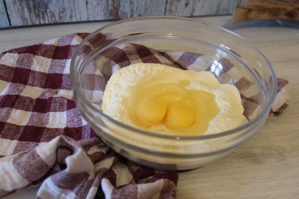Zuerst den Hartweizengrieß und die Eier oder das Wasser in einer Schüssel gut und lange kneten, etwa zehn Minuten. Mit Frischhaltefolie abdecken und mindestens dreißig Minuten ruhen lassen, damit sie nicht austrocknet. In der Zwischenzeit können Sie das Gemüse putzen und schneiden