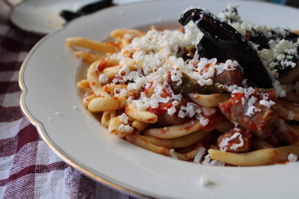 Nachdem der Teig geruht hat, in Stücke schneiden und ca. 1 cm dicke Stangen formen; in 2/3 cm lange Stücke schneiden und die Stücke auf etwa 3 mm dicke Schnüre ausrollen, den Spieß in der Mitte längs anlegen und auf sich selbst rollen lassen; so erhalten Sie die Pasta. Im Video sind alle Schritte zu sehen.