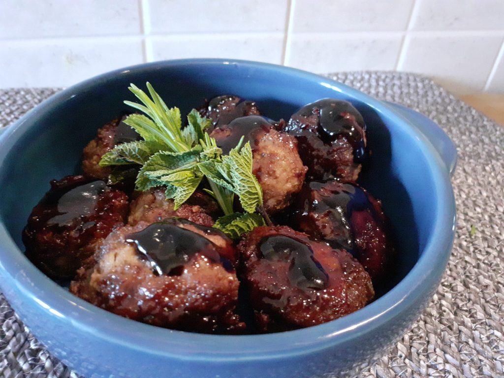Im Kühlschrank für ein paar Tage in einem geschlossenen Behälter aufbewahren. Nach Belieben garnieren. Ich habe eine grüne Sauce, eine getoastete Chili in der Pfanne und Minzblätter verwendet. Natürlich kann man es heiß servieren. Kalt kommen die Aromen besser zur Geltung. Durch Variieren der Größe der Fleischbällchen kann man sie für einen rustikalen Aperitif vorbereiten, lange im Voraus.