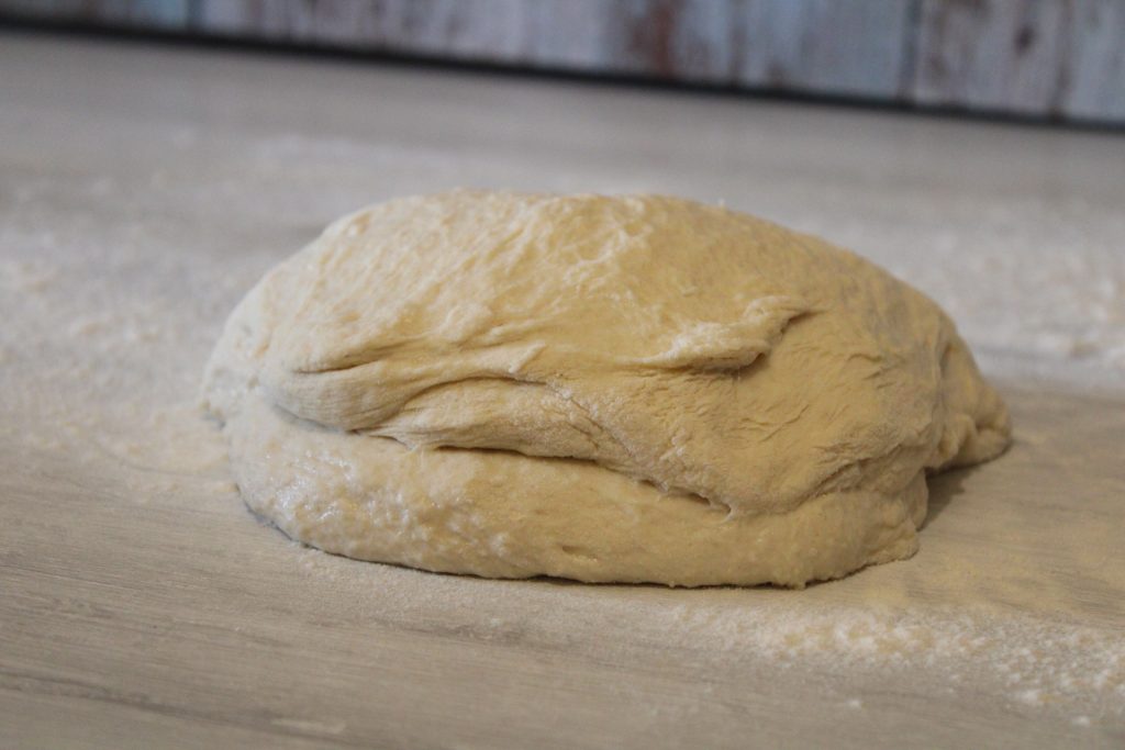• Aus der Schüssel nehmen und zwei Falten formen; an einem warmen Ort in einer bedeckten Schüssel bis zur Verdopplung aufgehen lassen.