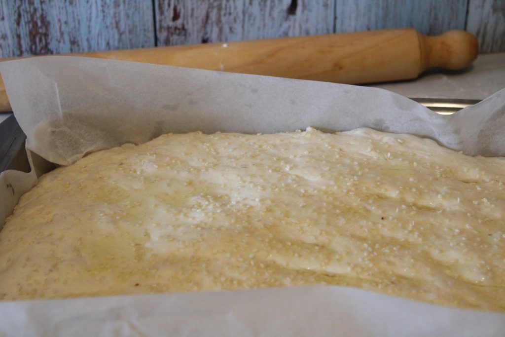 • Nach der erforderlichen Zeit die Form großzügig einfetten und den Teig hineingießen; abdecken und aufgehen lassen, die Oberfläche einölen, mit den Fingern eindrücken, um zusätzliche Blasen zu erzeugen, und Sesam darüber streuen und salzen. Im vorgeheizten Ofen bei 200 Grad etwa 40 Minuten backen. Wenn Sie eine Form mit den empfohlenen Maßen verwenden, wird sie etwa zwei cm dick sein, wenn Sie es höher mögen, verwenden Sie eine kleinere Form oder umgekehrt.