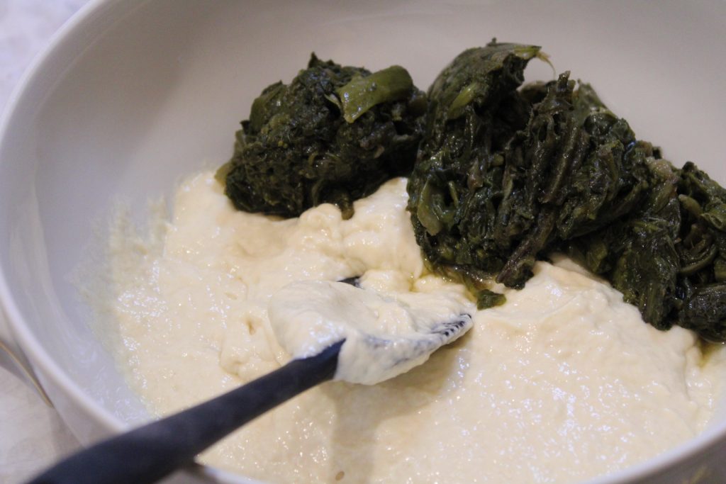 • 1 Tasse Borretsch (Blanchiert, kurz mit etwas Knoblauch in der Pfanne angeschwitzt und dann gehackt.)