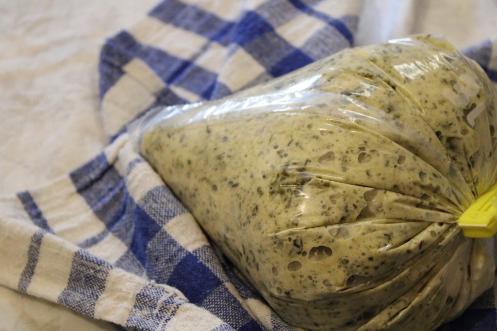 • In einer großen Schüssel Mehl, Hefe und das lauwarme Wasser in die Mitte geben und so lange rühren, bis sich die Hefe aufgelöst hat; dann Eier, Salz und Borretsch hinzufügen und gut vermengen.