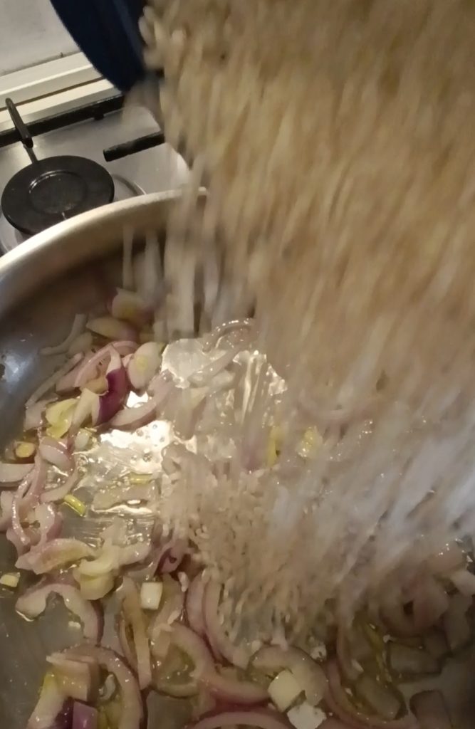 • Schneiden Sie nun die Frühlingszwiebel in Scheiben und braten Sie sie an, fügen Sie den Reis hinzu, rösten Sie ihn an und geben Sie die kochende Gemüsebrühe hinzu;
