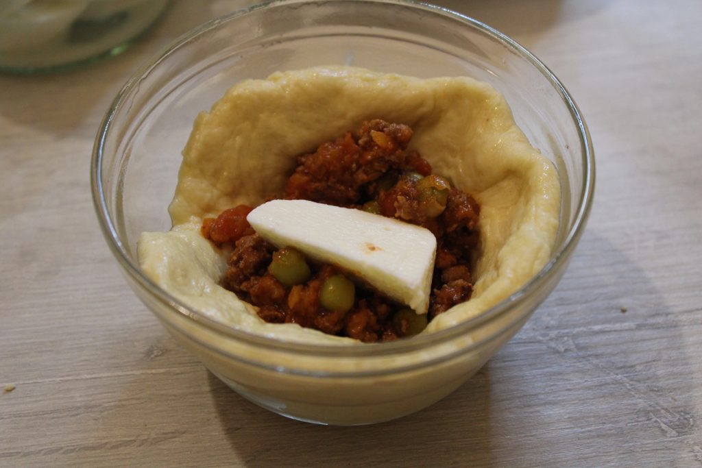 Nach der ersten Gehphase den Teig in 12 Portionen teilen, Scheiben formen und mit Ragù und Mozzarella füllen. Um die Arbeit zu erleichtern, können Sie eine Schüssel verwenden oder die Scheiben manuell formen, wie im Video gezeigt.