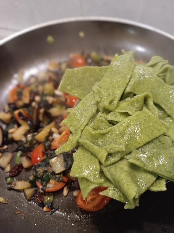 Die grünen Streifen mit Gemüse sind ein einfaches und köstliches Gericht, das ich durch meine Gewohnheit, nichts wegzuwerfen, zu machen gelernt habe. Es handelt sich um in unregelmäßige Form geschnittene und ebenso unregelmäßig beiseitegelegte Nudeln, wodurch die Streifen entstehen. Diesen Namen schlug mir eine ältere Dame vor, die mir zeigte, wie sie ihre hausgemachte Pasta zubereitete, und mir sagte, dass ich sie nach Belieben würzen könnte, indem ich den Vorratsschrank öffnete und die Zutaten je nach Verfügbarkeit auswählte. Seit diesem Tag wurden meine Pastaabschnitte zu den „Streifen“. Das Schöne an diesem Gericht ist, dass ich sie immer anders würzen kann, je nach Jahreszeit und mit frischem Gemüse, das ich finde. Es ist eine kreative Art, Reste zu verwenden und immer neue Rezepte zu kreieren. So fühle ich mich, während ich meine grünen Streifen mit Gemüse genieße, glücklich, diese Gewohnheit zu haben, die es mir ermöglicht, immer einzigartige und köstliche Gerichte zu experimentieren und zu genießen.