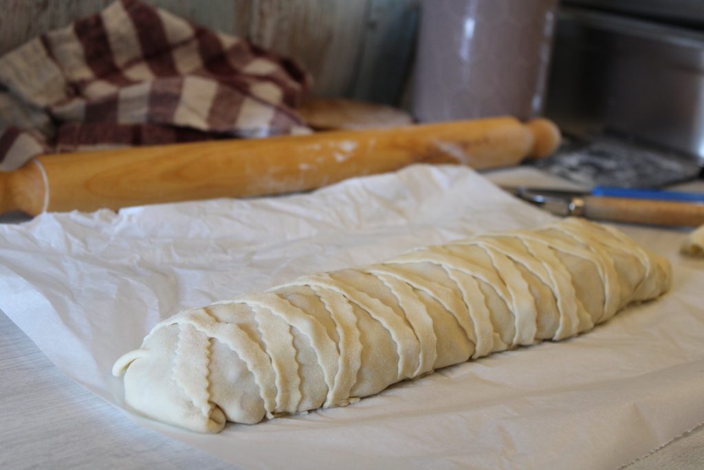 • Den Strudel mit Hilfe des Backpapiers aufrollen, die Ränder gut verschließen und mit dem restlichen Teig dekorieren.