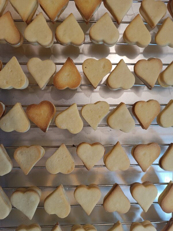 Dann den Mürbeteig ausrollen und Herzen ausstechen; im vorgeheizten Ofen bei 180 Grad wenige Minuten backen, um ein optimales Ergebnis zu erzielen, sollten sie nicht zu stark gebräunt werden.
