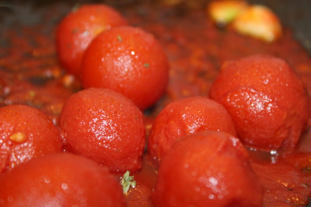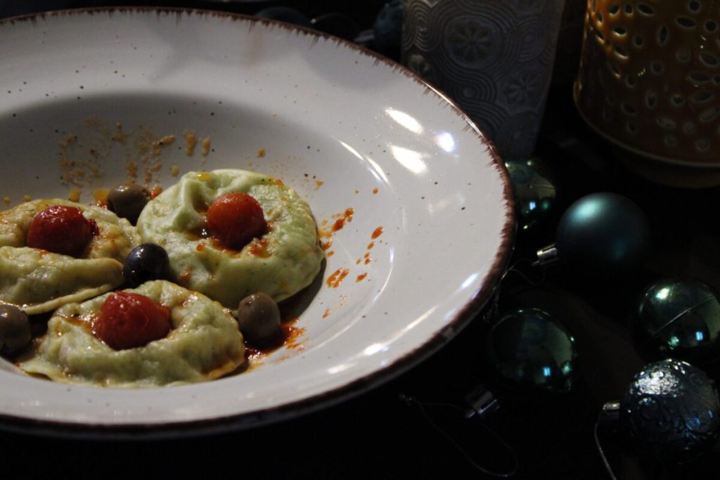 • In einer Pfanne den Knoblauch anbraten, die geschälten Kirschtomaten und den Oregano hinzufügen, mit Salz abschmecken und für ein paar Minuten kochen lassen, die Oliven hinzufügen und Ihre Ravioli würzen