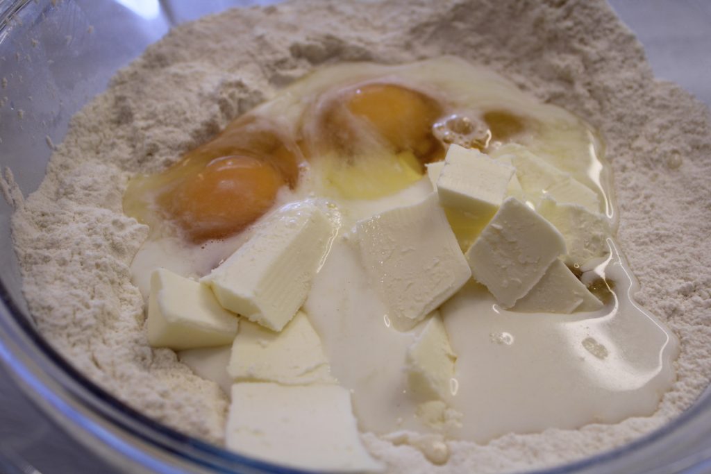 • In einer großen Schüssel Mehl, Backammoniak und Zucker geben; mischen und die restlichen Zutaten hinzufügen. Zitronenschale kann jetzt mit hinzugefügt werden; wenn Sie jedoch kandierte Früchte verwenden, empfehle ich, diese am Ende hinzuzufügen, um die Masse besser kneten zu können.