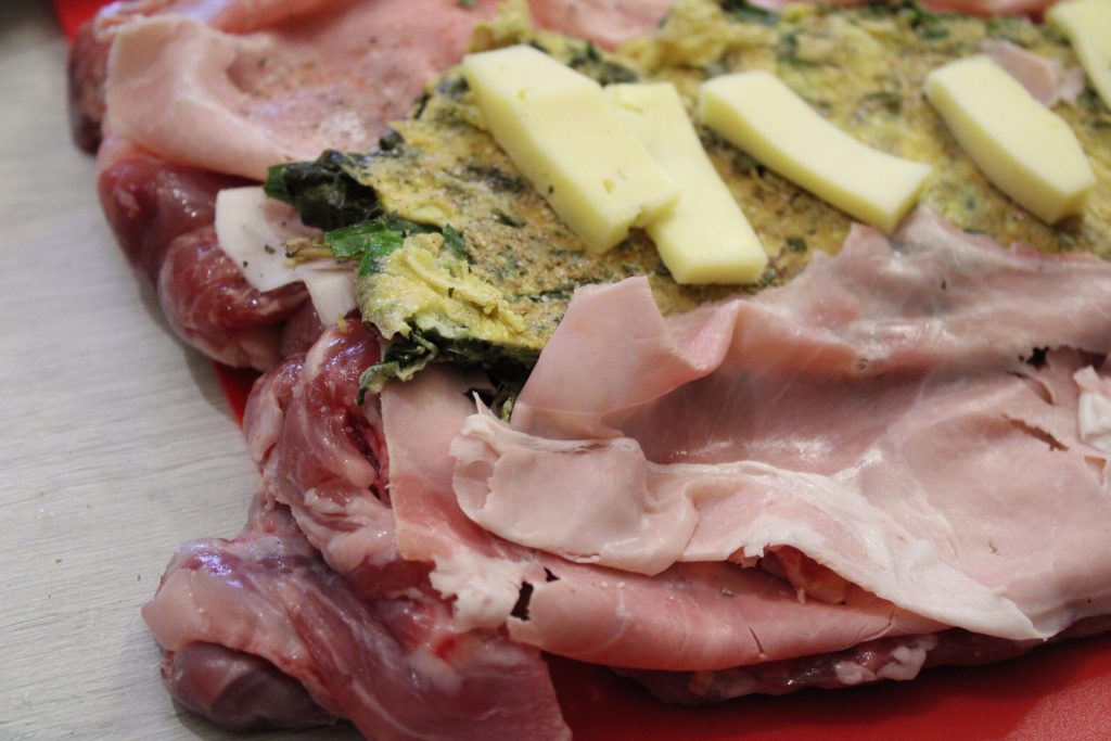 Nachdem Sie das Omelett vorbereitet haben, legen Sie das Kaninchen gut auf das Schneidebrett, bedecken Sie es mit Schinken, dem Omelett, dem Käse, salzen Sie und streuen Sie die gehackten aromatischen Kräuter darüber; sowohl getrocknete als auch frische sind geeignet.