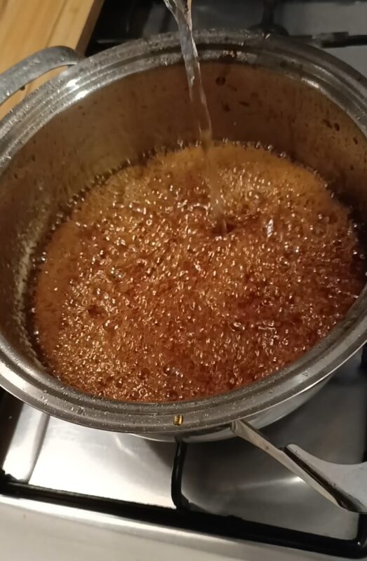 Das Rezept ist sehr einfach, die einzige Vorsichtsmaßnahme, da wir von Karamell sprechen, ist darauf zu achten, sich nicht zu verbrennen… in wenigen Minuten erhalten wir eine wunderschöne bernsteinfarbene Sauce, die wir nach Belieben verwenden können.