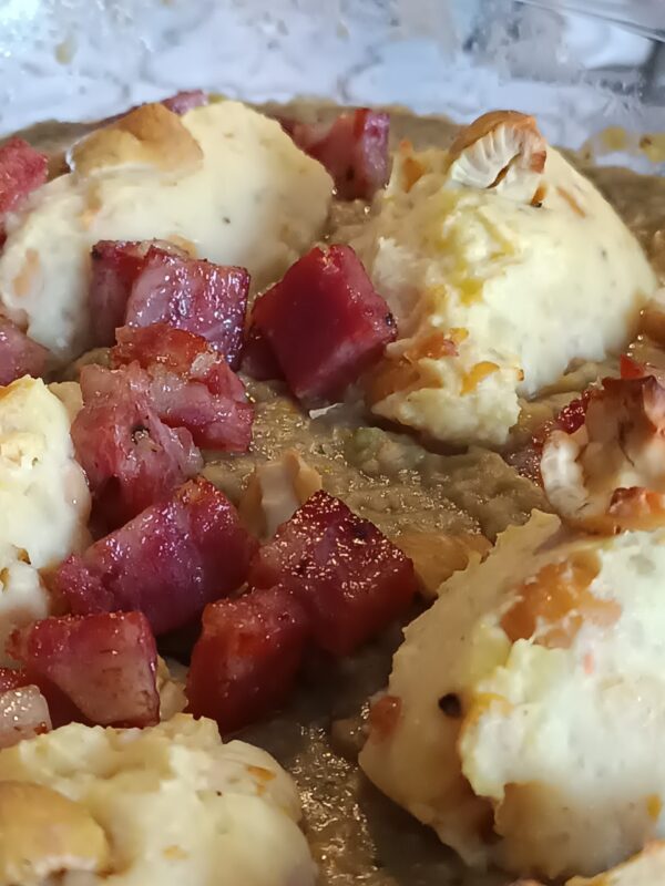 In die Auflaufform geben, zuerst die Kichererbsen- und Linsencreme, dann mit Hilfe von zwei Löffeln die Quenelles formen