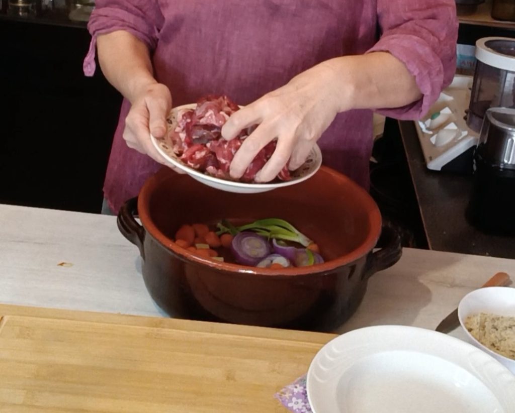 In den Tontopf das Öl und das in Stücke geschnittene Gemüse geben; sie dienen als Beilage, eventuell können Sie Artischocken hinzufügen…