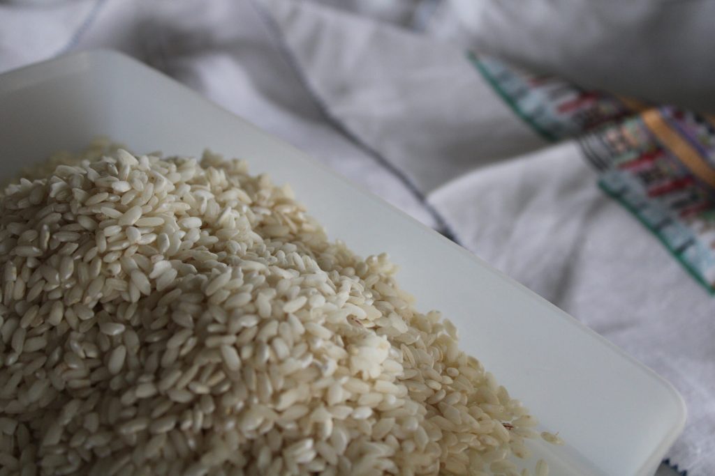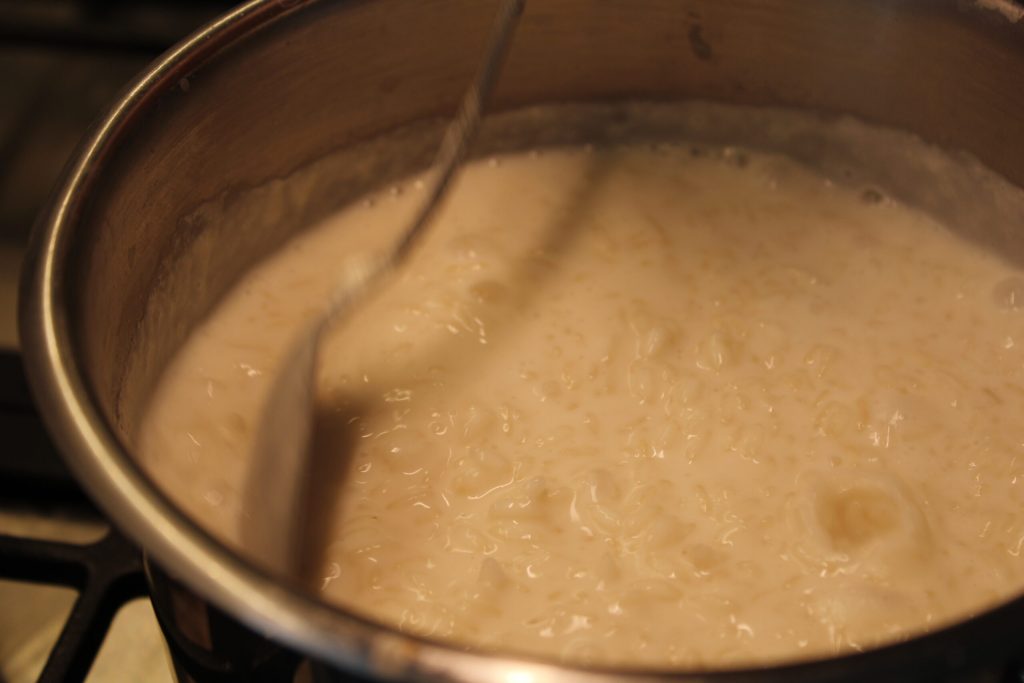 • Sobald aufgenommen, die heiße Milch hinzugeben und alles unter ständigem Rühren aufnehmen lassen. Mit Salz abschmecken. Der Reis sollte nicht al dente sein.