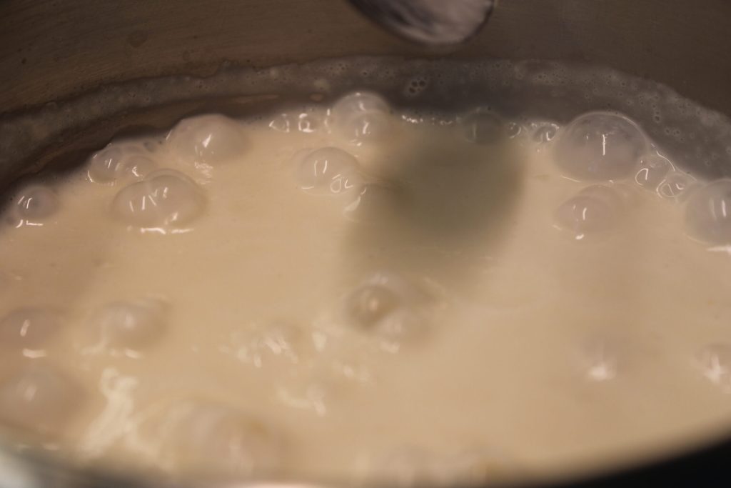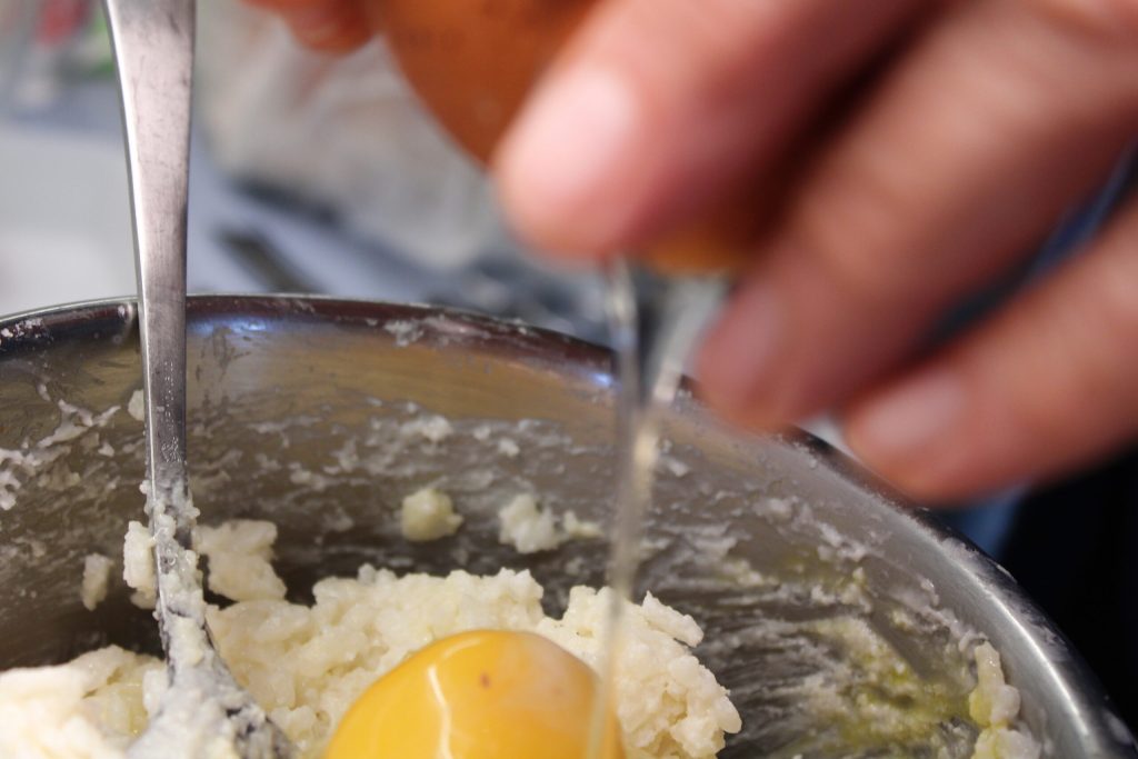 • Und sobald es lauwarm ist, die Eier nacheinander hinzufügen. Gut mischen und ruhen lassen.