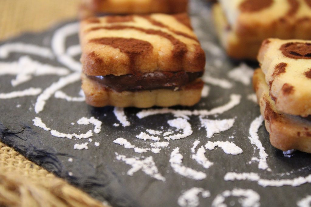 Mürbeteig mit Orangengeschmack, Haselnusscreme, Nutella ist perfekt, oder Zartbitterschokolade. Mit einer Schablone verziert und mit etwas Kakaopulver dekoriert.