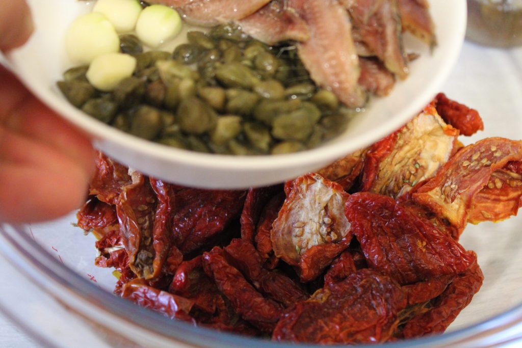 • In einer Schüssel die getrockneten Tomaten und die Oliven geben, dann Sardellen, Knoblauch, Thunfisch und Kapern hinzufügen.