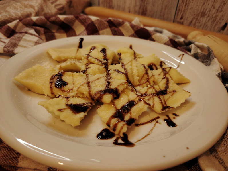 Ravioli sind fertig. Sie müssen sie nur in kochendem Salzwasser kochen und mit einem Spritzer Balsamico-Essig genießen