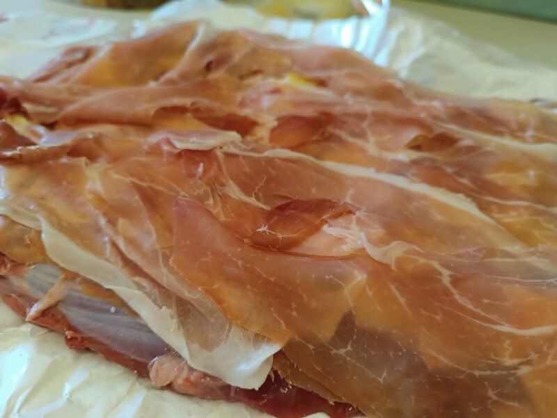 Um das Werk zu vollenden, legen Sie die zweite Schicht Schinken; nicht salzen, sonst wird der Braten zu salzig!