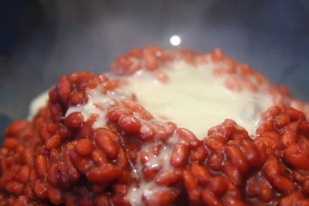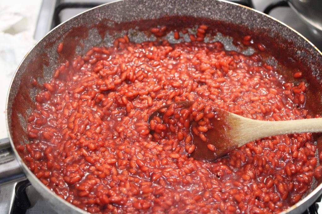 Sie können auch Fleischbrühe verwenden, wenn Sie das bevorzugen. Ich verwende Carnaroli-Reis und lasse ihn leicht al dente. Ich habe nicht mit Butter montiert, um das Gericht nicht zu beschweren; und ich habe keinen Parmesan hinzugefügt, damit der Gorgonzola in seiner Reinheit zur Geltung kommt. Im Ofen gegarte Rote Bete verleihen eine leicht andere Aromanuance; manchmal gare ich sie im Ofen des Holzherds und es entsteht eine rauchige Note. Den Gorgonzola bevorzuge ich mit Charakter, da er gut mit der natürlichen Süße der Rote Bete harmoniert.