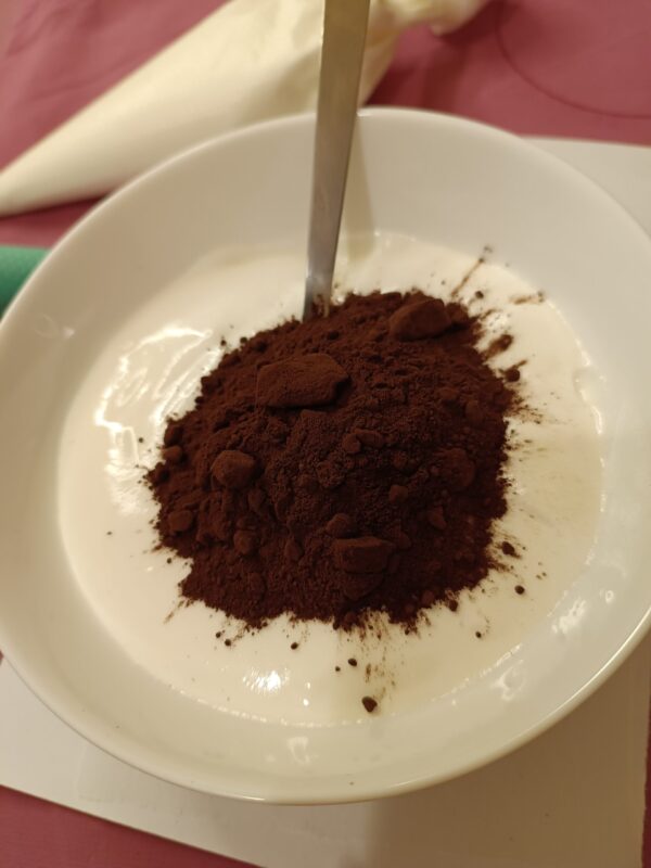 Um die braune Farbe zu erhalten, verwende ich Kakaopulver, ansonsten Gel-Farbstoffe; gut mischen, um eine glatte und homogene Mischung zu erhalten.
