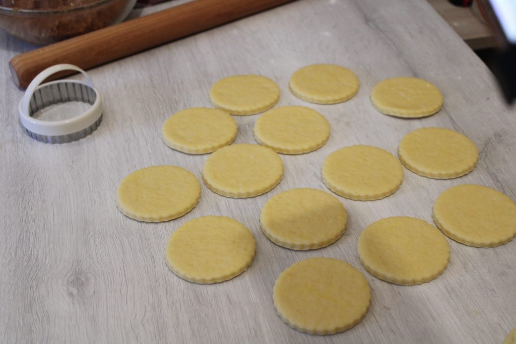 Nach der Ruhezeit rollt ihr den Teig auf der Arbeitsfläche aus und stecht Scheiben von etwa sechs Zentimetern Durchmesser aus.