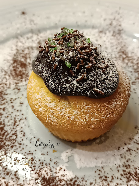 • Da ich auch Muffins gemacht habe, habe ich sie in der Mitte ausgehöhlt, einen Teelöffel Marmelade hinzugefügt und dann mit Schokolade und Puderzucker dekoriert