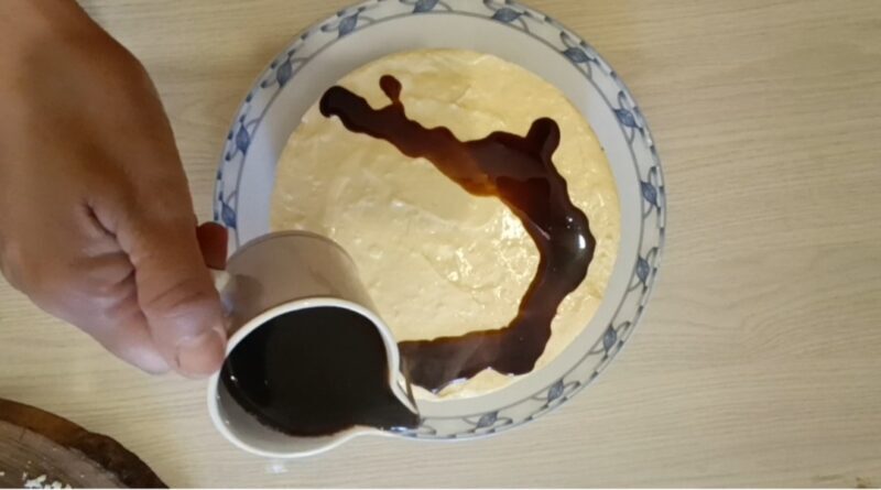 Bereiten Sie nun die Basis für das Gelée vor, nehmen Sie das Tiramisù aus dem Gefrierschrank, um es auf dem Tisch bereit zu haben, und stellen Sie es auf den Servierteller. Jetzt beenden Sie die Zubereitung des Gelées